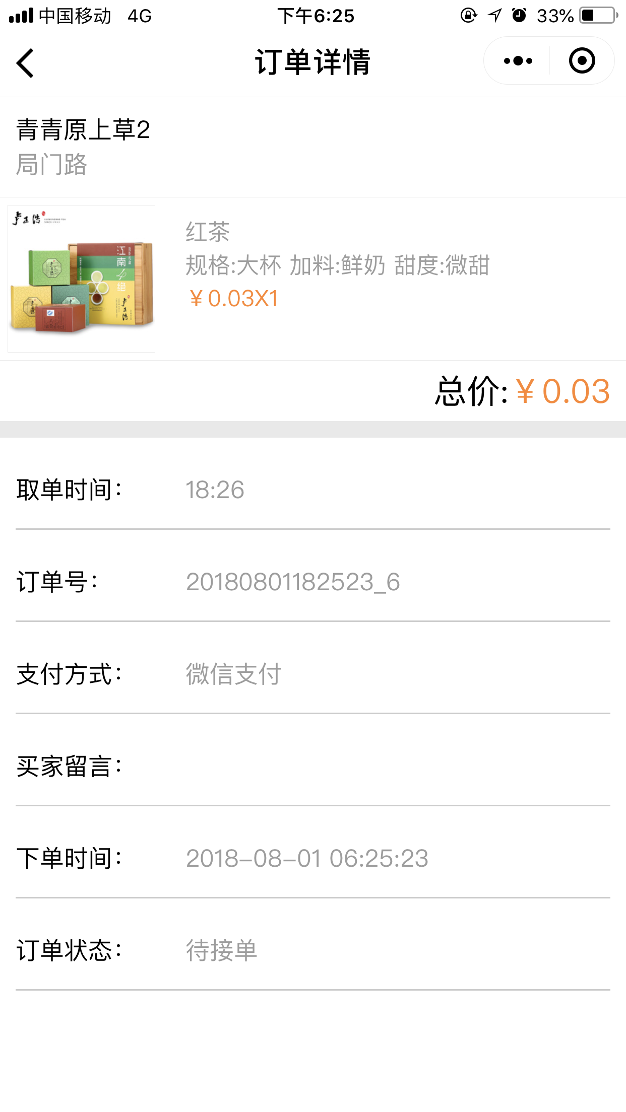4.在前台,用户点击“开始点单”可以根据位置匹配到最近的店面,并且可以选择取餐的方式“立即取餐”或“稍晚取餐”,进入点单列表页我们添加菜品时,可以选择我们在后台添加的“配料”、“口味”、以及“规格”等,选择完毕之后,点击“去结算”跳转到提交订单页面,取单时间根据用户的选择会显示为“立即取单”或者为“取单的时间点”,提交订单后,会跳转到“订单详情”页面,当商家在后台点击“接单”接单后,会有“取餐码”显示出来,如图所示: